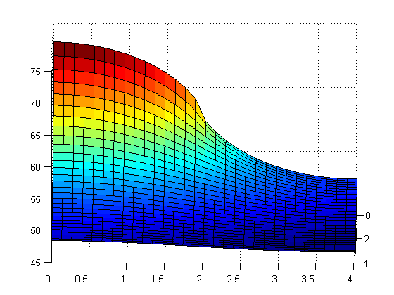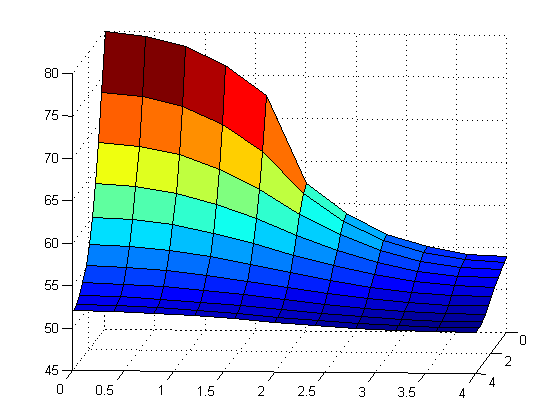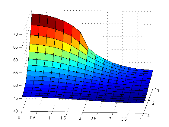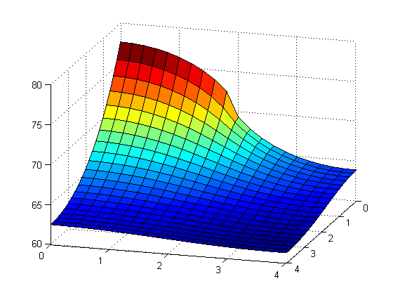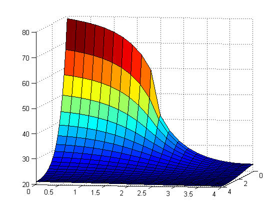 \(\star\)\(\star\)ALSO NOTE: Our axes are not labelled so that we can have a better view of the graph. The x and y axes are on the left and right while the z axis is going up. Where the x and y axes are the dimensions of the fin and the z axis is the temperature.\(\star\)\(\star\)