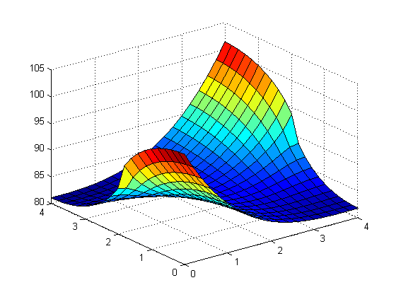 For this part of the project we increased the dimensions of the fin with to 4 \(\times\) 4 cm and 1 mm thickness. We assumed that 5W of power on the interval [0,2] on the left side of the fin. We were to solve the PDE with M = N = 20 steps in the x and y directions. We were also to solve the maximum temperature of the fin in \(\circ\)C. And finally we were to experiment with increased values of M and N and to see how much the solution was to change.