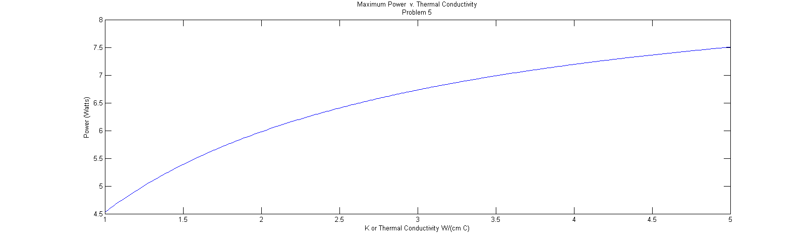 We were to plot the maximum power that can be dissipated in the previous problem. We had the function to be for 1\(\le\)K\(\le\)5\(\frac{W}{cm ^\circ C}\)