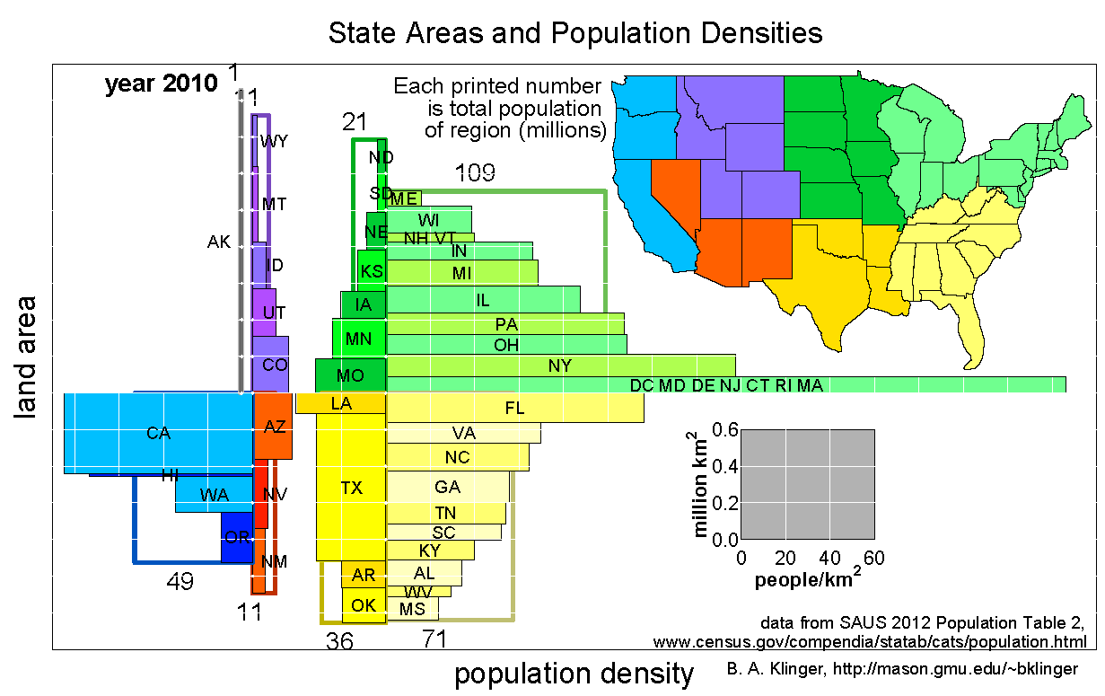 Many people know that some states, such as Alaska and Wyoming, have large areas and few people, others, like New Jersey, have small areas and a larger population, and others, such as California and Texas, are big in both area and population. As with nations, the states can be compared with a single figure in which each rectangle represents state area (rectangle height), state population density (rectangle width), and state population (rectangle area).