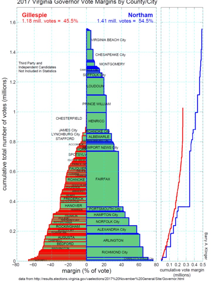 Each box in the figure represents the election results from one Virginia county or city. Gillespie won in each county/city in the stack on the left and Northam won in those on the right. The width of a box represents the percentage margin of victory, and the height represents the total number of votes cast for the two candidates. Thus in Fairfax, Northam got nearly 40% more votes of the nearly .4 million cast. This shows both the intensity of the victory and its contribution to the state total, since a taller box has a greater impact on the election than a shorter one. The area of the box tells the size of the margin in number of votes. For more on using this kind of graph to analyze elections, see The 2016 Presidential Election