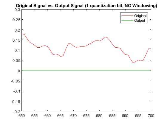 With a quantization bit of b=1, RMSE without windowing was 0.0878143936932681 and with windowing was 0.0822777373514979. The Plots below display the differences between original signal and produced signal for both windowing and non-windowing simpleCodec functions: