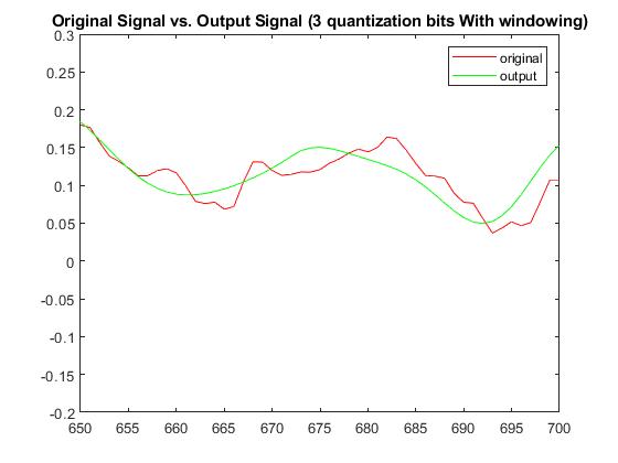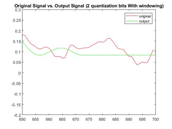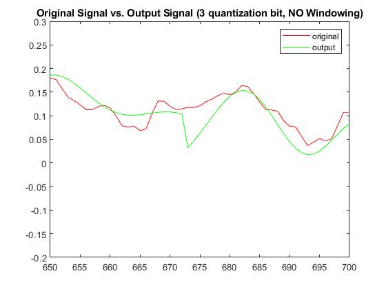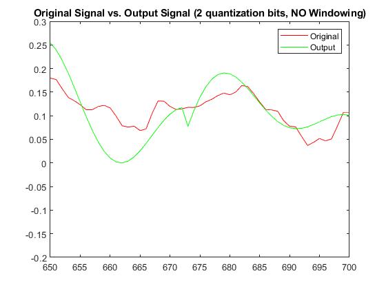 With a quantization bit of b=2, RMSE without windowing was 0.04715143878519 and with windowing was 0.0382730656893698. The Plots below display the differences between original signal and produced signal for both windowing and non-windowing simpleCodec functions: