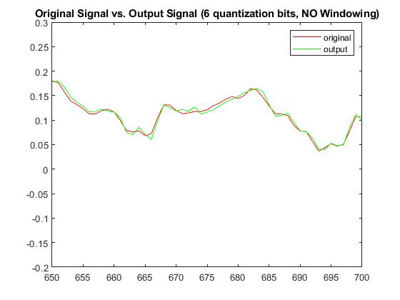With a quantization bit of b=6, RMSE without windowing was 0.00644879139492435 and with windowing was 0.00407707490017487. The Plots below display the differences between original signal and produced signal for both windowing and non-windowing simpleCodec functions: