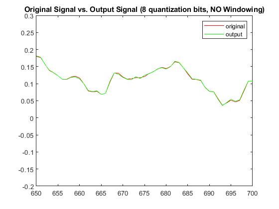 With a quantization bit of b=8, RMSE without windowing was 0.00160114157313961 and with windowing was 0.00131969706498556. The Plots below display the differences between original signal and produced signal for both windowing and non-windowing simpleCodec functions: