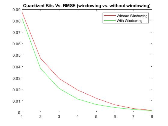 A final plot that displays the relationships between RMSE when a windowing function is applied / also when the number of bits changes is seen below from a range of 1 to 8 bits: