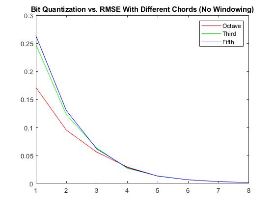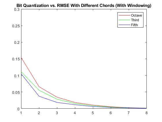 As Evident, each differnt constructed chord displays the same pattern where an increase in the number of quantized bits per window results in a decrease in RMSE. In general, it also appears that the compressed octave produces a relatively lower RMSE compared to a third and a fifth, and a fifth produces relatively higher RMSEs.