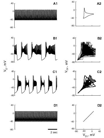 Dynamic responses of pair of identical neurons. PNMDA = 1.58 .10-6 cm/s. A: Gc = 0 ; B: Gc = 2 .10-5 S/cm2 ; C: Gc = 6 .10-5 S/cm2 ; D: Gc = 7 .10-5 S/cm2 . Left column: Membrane potential of one neuron. Right column: Phase portraits for membrane potentials (VD1, VD2) as a function of increasing coupling strength. Each phase portrait corresponds to firing patterns on the Left. Gc = 0 - single spiking with phase shift.; Gc = 2 .10-5 - 6 .10-5 S/cm2 - different kinds of bursting activity; Gc = 7 .10-5 S/cm2 - completely synchronized oscillations. |