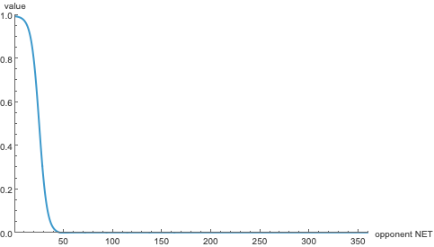 The logistic function \(\mathcal L_{-\nicefrac 14}(O, I+15)\), used to weight upset losses. Basically, the worse your opponent was relative to you, the higher the penalty.