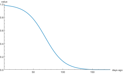 Each of the real-valued variables are transformed by a logistic function \[\mathcal L_\gamma(x,y) = \frac{1}{1 + e^{\gamma(x-y)}}, \] where \(\gamma\) controls the slope of the curve and \(y\) is the coordinate of the axis of symmetry. Here’s the logistic function \(\mathcal L_{\nicefrac{1}{16}}(x, 70)\) that specifies the weight of a game according to the number of days \(x\) since it was played: