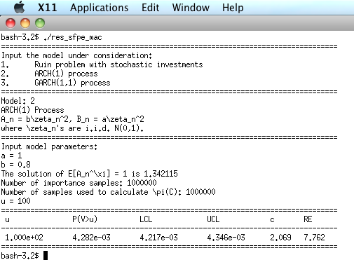 The program implements the importance sampling algorithm for estimating the tail probabilities for three types of processes: (1) ruin problem with stochastic investments; (2) ARCH(1); and (3) GARCH(1,1).