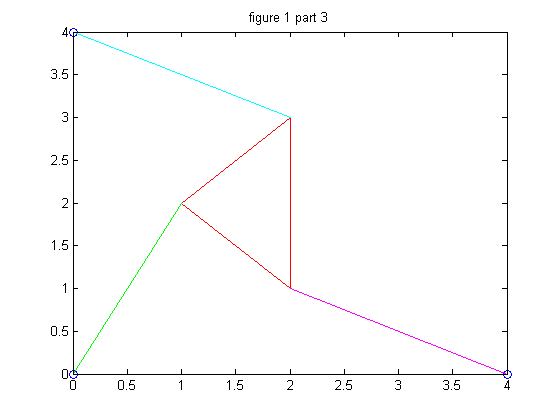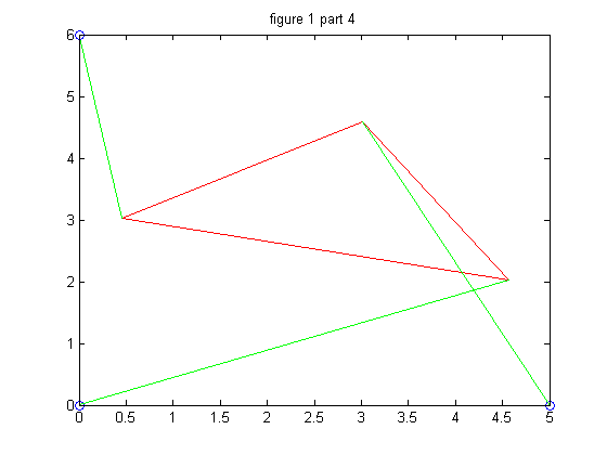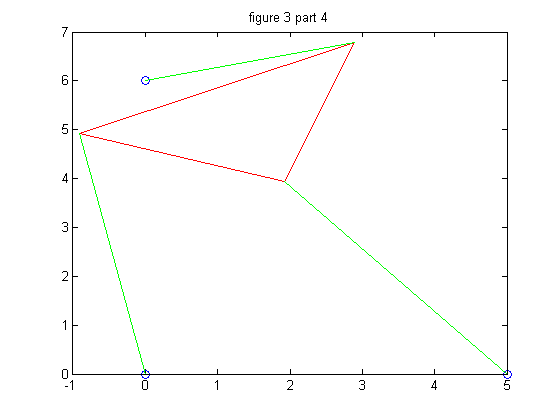 Part 4 is where we really got to work with the problem. Using a set of parameters adn the bisection method we found the roots of the function which correspond to the positions of the platform. To use the bisection method we plotted the function on the range [-pi,pi] and then took a positive and negative point before and after each intersection with the x axis. This gave us the zeros / roots of the function which correspond to an angle that has a position. We then generated (x,y) values for said platforms and plotted the various structures.