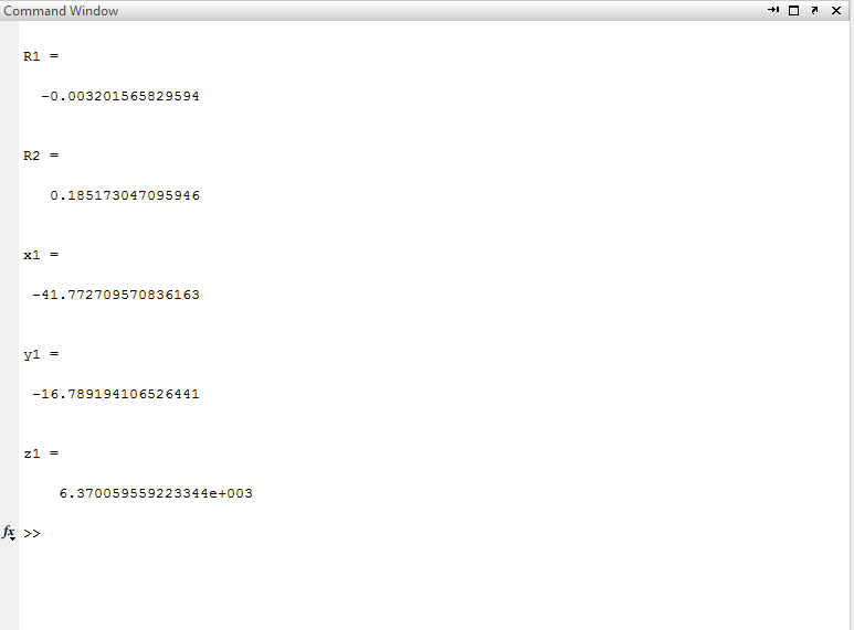 Thus we want to solve (1) for \(i = \{1,2,3,4\}\) using a multivariate Newton's to be sure that our \((x,y,z,d) = (-41.77271, -16.78919, 6370.0596, -.003201566)\). Attached here is our MATLAB code, and below is an example run of this code. Newton's method took 4 iterations to converge to the answer with an initial guess of (0, 100, 6400, 0.0001).