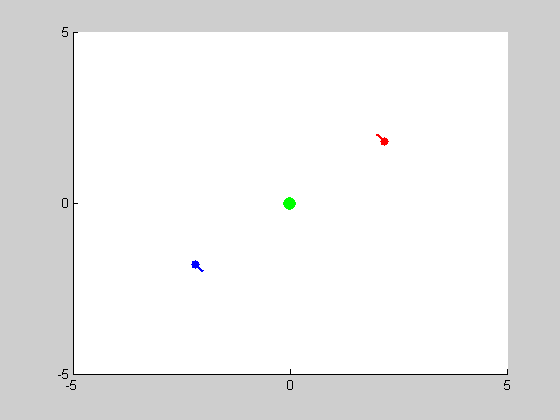We will be solving a two-body problem for this step. The given masses are: \(m_1 = 0.03\), and \(m_2 = 0.3\). We are asked to plot the trajectories with intial conditions: \((x_1, y_1) = (2,2)\), \((x'_1, y'_1) = (0.2,-0.2)\) and \((x_2, y_2) = (0,0)\), \((x'_2, y'_2) = (-0.02,0.02)\). We use MATLAB program orbit2b.m to obtain the following results: