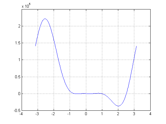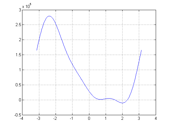 2. We used a slightly modified version of the code for the function \(f(\theta)\) which allowed the function to accept matrix inputs properly so that it could be plotted along with the plot method to achieve this plot of \(f\) on the interval \([-\pi,\pi]\).