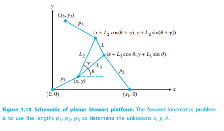 A Stewart platform is normally a three-dimensional platform that has 6 struts that vary in length and move around a platform. However for the sake of this project we dealt with a two dimensional version of the Stewart platform. In this project we wanted to find the postion of the platform given the length of the three struts. Below is an example of the two dimensional version of a Stewart platform that we dealt with.