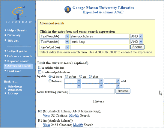 The "advanced search" option in the Expanded Academic ASAP also allows you to specify fields and Boolean relationships (AND, OR, NOT, etc.), as well as type of source, range of dates, and specific journals. The results summary at the bottom of the screen shows that searching on "sherlock holmes" as a phrase in the text yields over 2,400 citations; connecting this (using the right-hand pull-down menu option AND) with "laurie king," a contemporary author who features the Holmes character in her novels, as a text word reduces the citations to 32. Note that this database treats adjacent words (like sherlock holmes) as phrases and, like most databases, is not case sensitive. |