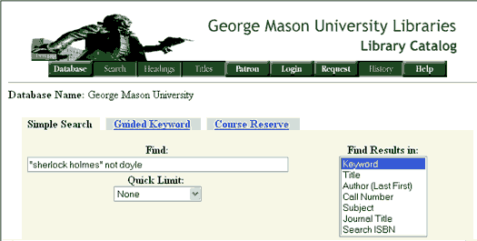 This keyword search would allow you to target treatments of the Sherlock Holmes that do not involve Sir Arthur Conan Doyle. A search on "Sherlock Holmes" in the online catalog would yield over 90 records; adding "not doyle" reduces your hits to about 25 records. |